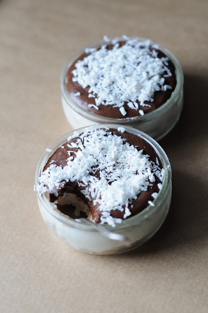 Kiedy krem będzie już letni, rozsmarować go na wierzchu wcześniej przygotowanych deserów. Wstawić do lodówki na około 4 godziny. Przed podaniem udekorować wiórkami kokosowymi.